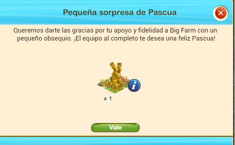 ¡Este año por Pascua, además de nuestros queridos y divertidos eventos de Pascua, tendremos algo más para disculparnos por el montón de problemas con el servidor en las últimas semanas y también para desearte una feliz Pascua de parte de la familia Big Farm! ¡Cada jugador recibirá una estatua de conejito de Pascua para colocar en una de sus granjas o en el Valle de las Decoraciones! y se podrá obtener del 8 al 23 de abril.