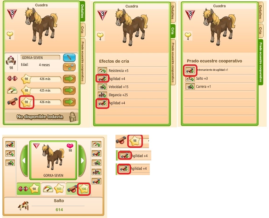 En el caso de los entrenamientos y cruces realizados en el Prado Ecuestre, cuando cruzas un caballo los Efectos de Fuerza, Resistencia y Agilidad pueden ser incorporados en el apartado de Prado Ecuestre Cooperativo como en este caso ocurre con el Entrenamiento de Agilidad +1.