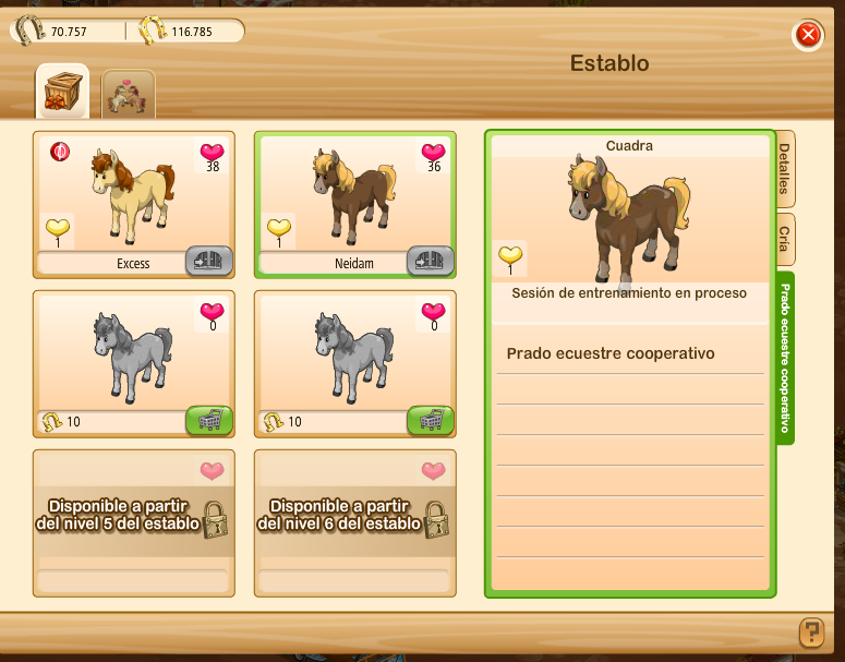 Para entrenarlo has de darle unos items que puedes hacer en la panaderia.en el pueblo cooperativo y a veces te los regala el juego en campeonatos,cuando el corazon se vuelve rojo si en tu cooperativa hay alguien que tiene caballos en el prado puedes elegir a uno y criar,dependiendo del nivel de los dos caballos,puedes conseguir crias de nivel 1 o de nivel 2 pero esto ultimo es mas suerte que seguridad