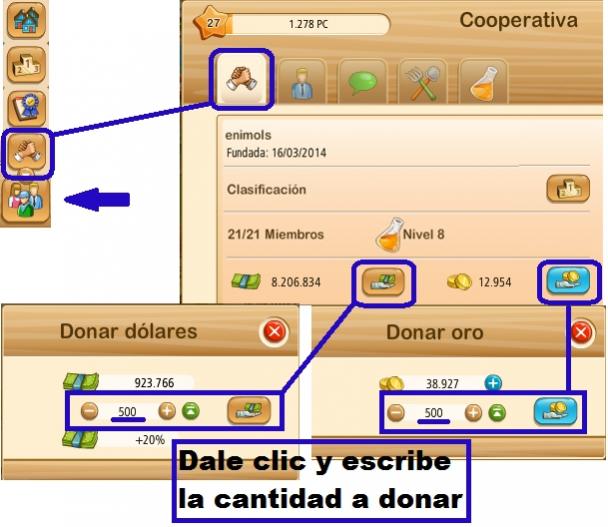 - Donar tanto en dolares como en oro semanalmente según vuestro nivel, podéis ver cuales son las donaciones que pide la cooperativa visitando en el juego la Cooperativa-Resumen-Noticias.