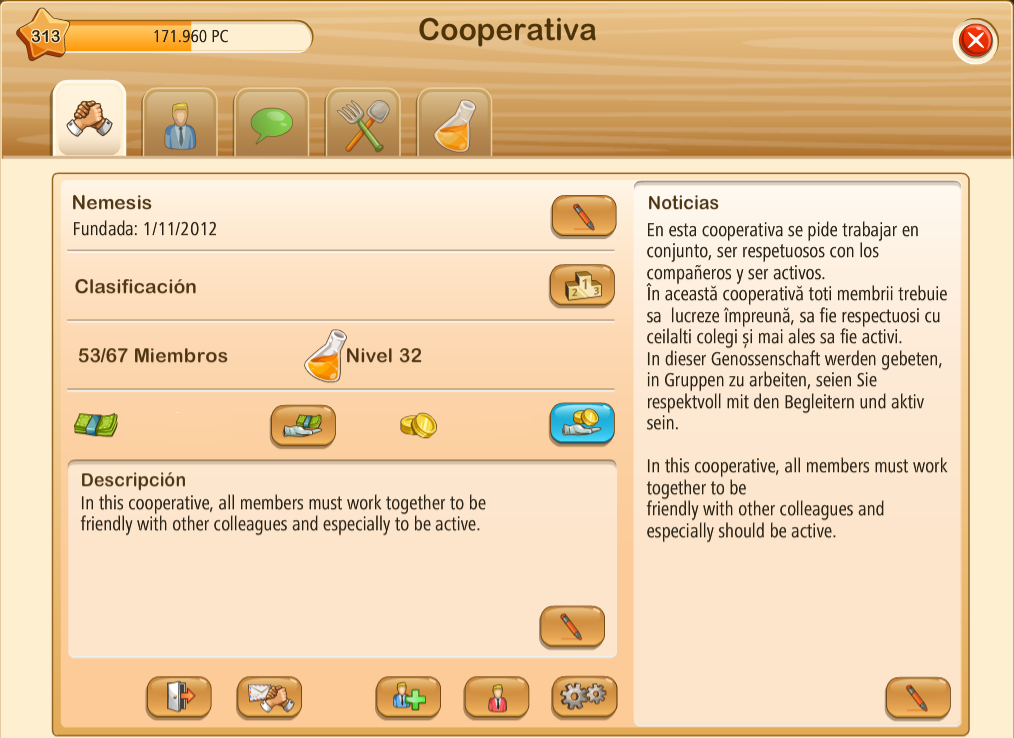 ahora soy yo el jefe, estoy conectado todos los días y nos va muy bien. solo pedimos que colaboren en las investigaciones y proyectos. los proyectos solo lo hacemos cuando vemos que hay un numero considerable de compañeros para realizar dicha prueba, si no para k malgastar recursos innecesarios cuando se pueden usar en otra ocasión, ya que cuestan mucho conseguirlos. ahora somos 8, hemos expulsado a 7 por falta de cooperación ya que a los nuevos les cuesta mucho seguir el ritmo deberían ponérselo A los principiantes mas fácil asta k alcance un nivel apropiado para unirse a una cooperativa esa es mi opinión.