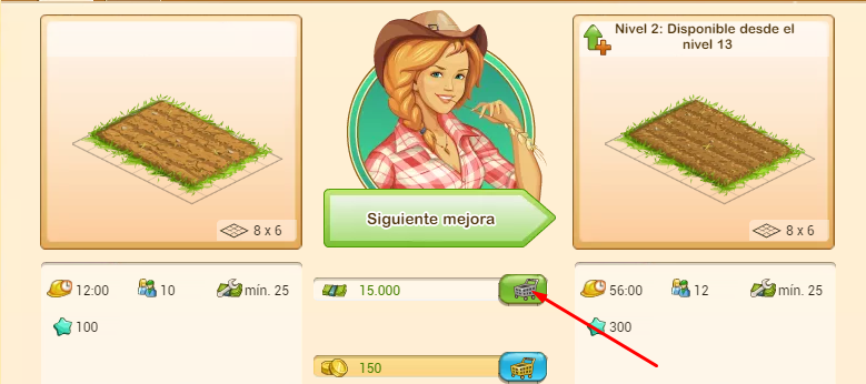 Tienes dos opciones, o poner mas campos o subirlos de nivel. Para subirlos de nivel tienes que tener varias cosas en cuenta. En primer lugar de cuantos trabajadores libres dispones. Aquí te indica los trabajadores necesarios para subir de nivel, si esta en rojo es que no tienes suficientes. Entonces tendrás que subir de nivel una casa o construir otra en tu caso yo construiría una nueva casa. Una vez tengas trabajadores suficientes Haz clic en mejorar como te indica la flecha. Accionar donde indica la flecha y a esperar a que mejore. Espero que te haya servido la explicación un saludo. canco