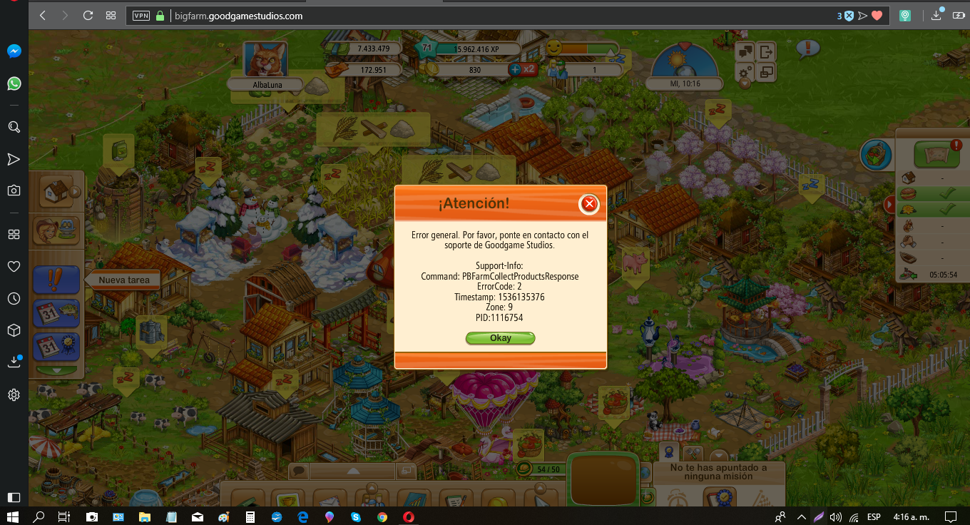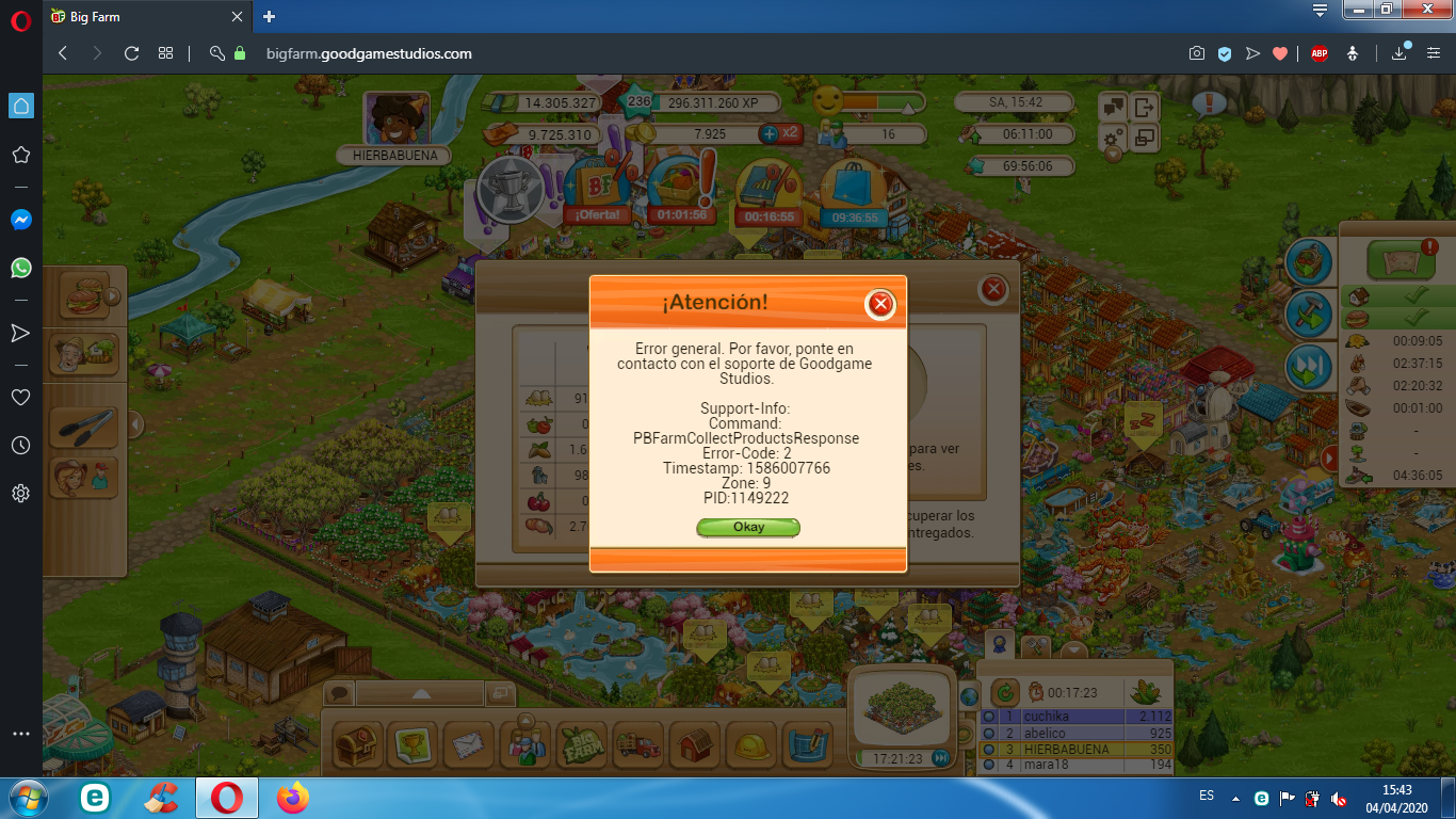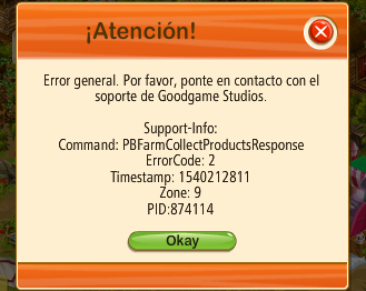 Buenas tardes Maty.Quiero comunicarte un codigo error ,que me sale cada vez que recojo producto en mi panaderia de la granja gourmet.Aqui te dejo captura de pantalla.En cuanto al otro asunto ,todo sigue igual,sin noticias.