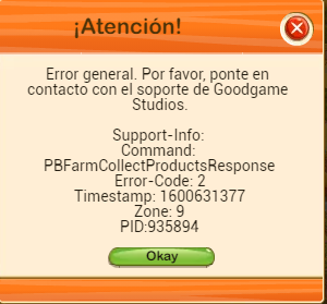 Buenas tardes @HIERBABUENA (ES1) : El error code 2 aparece a veces cuando hay un poco de retraso en el juego a la vez que tú intentas hacer alguna acción pinchando algún edificio o las cosechas por ejemplo. En ese caso, ese error code aparece porque el juego no responde correctamente pero es suficiente con que vuelvas a recargar el juego para que te desaparezca el mensaje y puedas seguir jugando como lo estabas haciendo. Por otra parte, sobre tu otro asunto a mi me contestaron lo que te comenté pero en cualquier caso, el lunes volveré a preguntar por ese tema