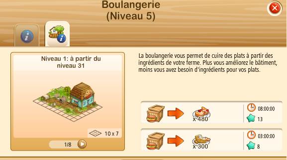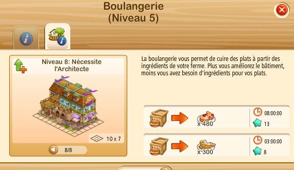 je voulais augmenter ma boulangerie au niveau 6 et donc voir la différence qu'on obtenait en la upant pour comparer la rentabilité mais dans l'onglet "information du produit" rien ne change quand je passe du nouveau 1 au niveau 8 les gains de produits sont identiques et les temps de fabrication aussi. J'ai vidé le cache et fait un nettoyage de mon ordi ce week donc je ne pense pas que le bug viennent de chez moi, et je n'ai ce probleme que sur ce batiment sur les autres ça fonctionne.