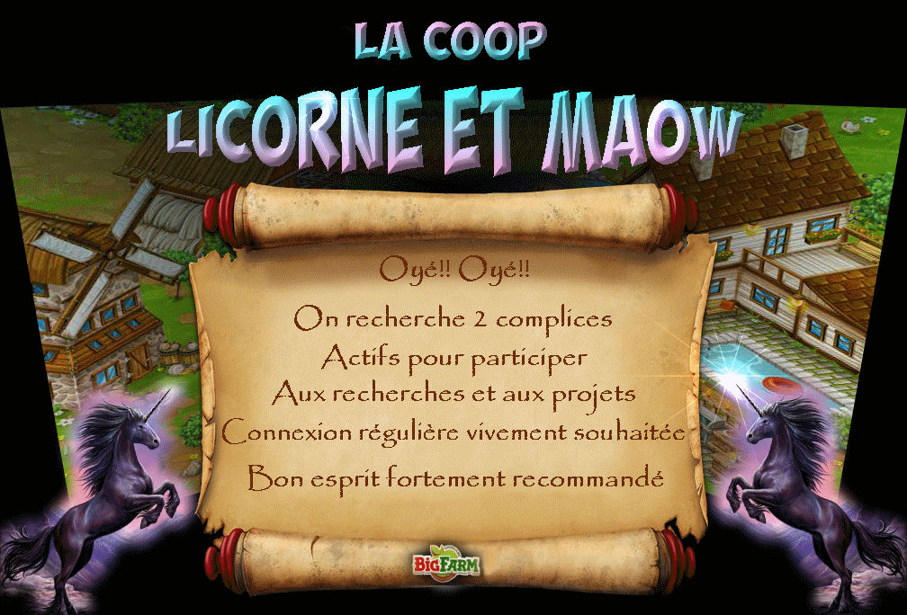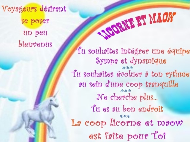 la coop licorne et maow propose aux joueuses et joueurs voyageuses ou voyageurs , mais pas que ^^ de venir rejoindre la petite équipe qui l anime!