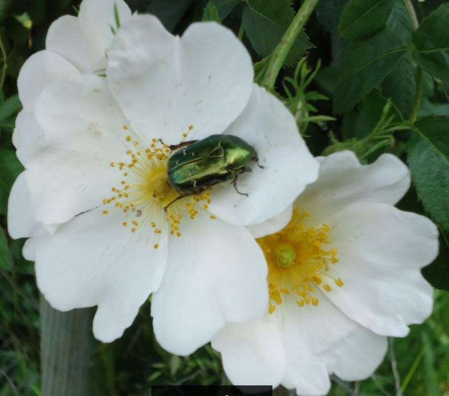 J'ai fait la photo sur le rosier sauvage qui réapparait après que le rosier greffé soit mort. Ce coléoptère, est précisément la cétoine dorée...belle la nature