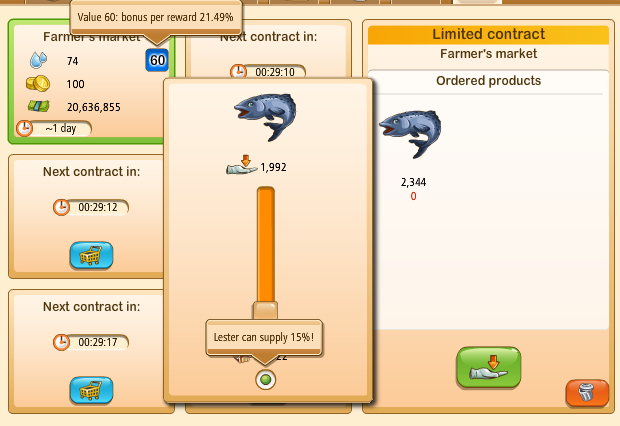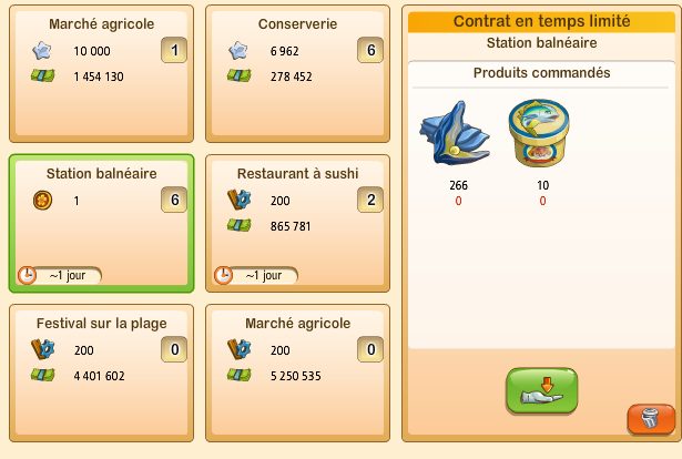 Après environ 17 contrats, je suis passé à 4 offres. ..... 52 contrats, je suis passé à 6 contrats, tous au niveau 0. ..... 55 contrats, j'ai eu mon 1er contrat niv 2 Vers le 71, j'ai eu mon 1er contrat niv 8. Le voici: marché agricole, niv 8: 176 thons, 204 palourdes, 65 homards -> 9 gouttes d'eau, 209 867$ (oui, avec des gouttes d'eau !!!) et un niveau 7: centre de vacances: 10 amorces thon, 61 homards -> 3 gouttes d'eau, 207 535$ (oui, aussi avec des gouttes d'eau).