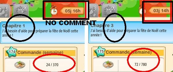 Ensuite, concernant cette histoire de pourcentages que je lis à toutes les sauces depuis hier je ne puis que renvoyer vers le communiqué que j'ai posté. Il parle d'une diminution de 25% des produits demandés, oui, mais sur l'étape 3 des chapitres, pas sur toute la durée des chapitres, ce afin de permettre aux joueurs de bénéficier plus facilement de points de satisfaction bonus, tant normale que villageoise.