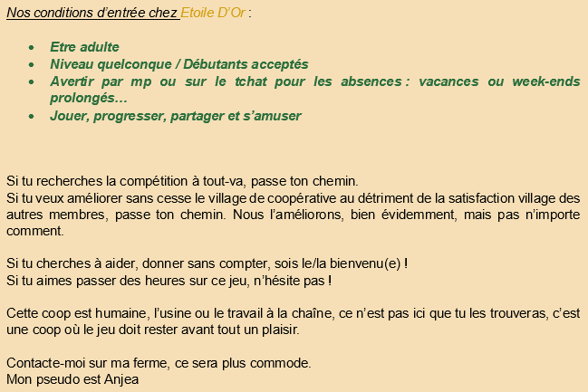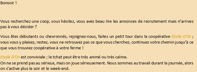 Tu veux des réponses quand tu poses une question sur le tchat ? bonne pioche ! Tu veux pouvoir rester muet/muette sur le tchat ? bonne pioche ! Tu veux participer aux défis et aux missions et aux CC et et et ? bonne pioche ! Tu veux avoir le droit de papoter de tout et de rien sur le tchat ? bonne pioche ! Tu veux avoir le droit de te détendre et de jouer relax quand ça te chante ? bonne pioche ! Là, je me demande ce que tu attends pour me mp dans ma ferme ?! Pardon ? Tu hésites encore ? Ah oui, les avantages que tu auras dans la coop : clique ici.