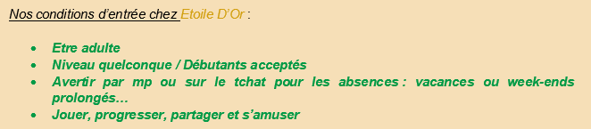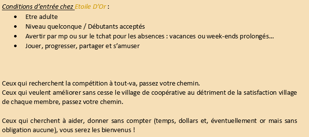 Tu devras être adulte et poli - bonjour, merci, stp ... etc etc -. Tu devras répondre aux mp quand on attendra une réponse de ta part. Tu devras participer activement et non pas juste faire acte de présence 5 minutes par jour ( en revanche, tu seras excusé et gardé si, par mp, tu m'expliques tes absences - je peux comprendre, je ne suis pas que bête ^^ ) Ton niveau m'importe peu, c'est ton 'amour' du jeu qui m'importera le plus .