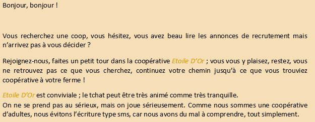 Lis mes autres posts, tu en apprendras encore plus sur le mode de fonctionnement de la coop