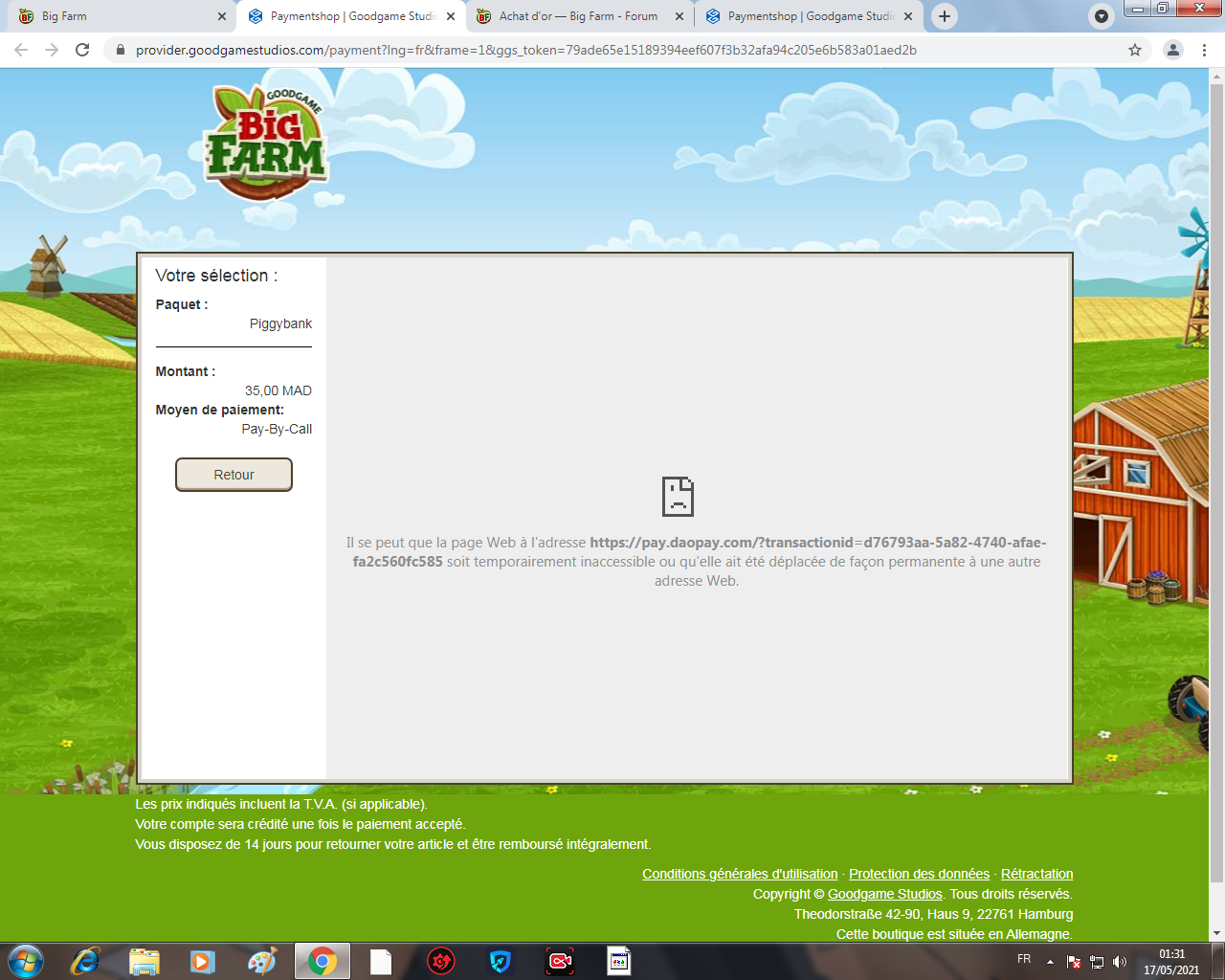 Bonjour , je narrive pas à acheter un pack d'or ou meme acheter la tirelire qui est sous forme de cochon ; quand je click sur un mode de paiement ils disent que la page a ete deplacé vers un autre site