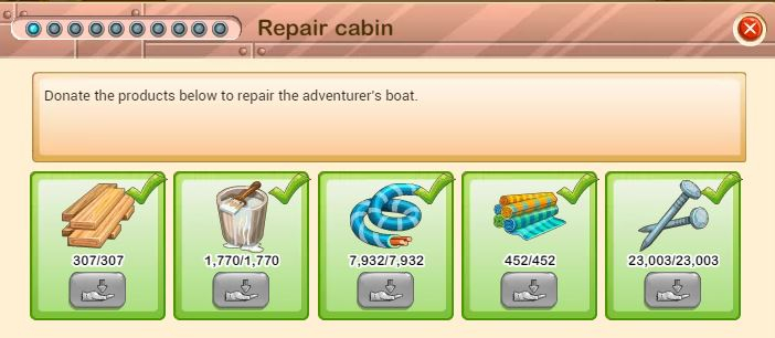 Avec notre village de coop niv 101, le radeau (niv 1) nous demande, comme Christiane : toutes les haies, des clous, des cordes mais aussi de la résine.