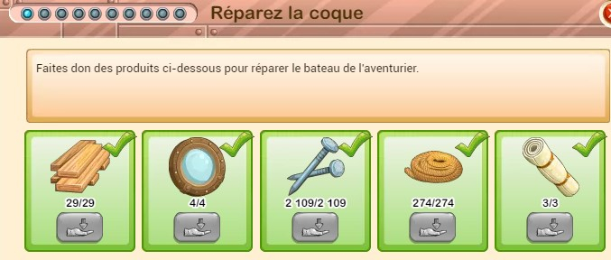 Pour notre coop, niveau de village 94 et radeau niv 2, on nous demande toutes les haies, des clous, cordes, résine et caoutchouc