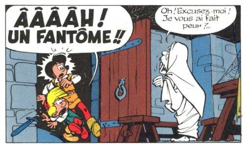 un sort : un fantôme bleu qui est attaqué par un aspirateur rouge !