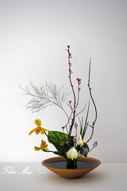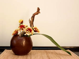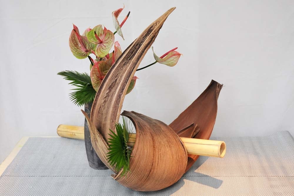 Un ikebana est la représentation d’un paysage, d’un petit univers en trois dimensions recréé dans un contenant grâce à trois lignes directrices de tailles différentes, Shin, Soe et Tai, qui symbolisent le ciel, la terre et l’homme.
