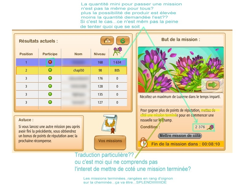 1- les quantités minimales demandées pour "passer" un mission varient selon les capacités de prod du joueur (si j'ai bien tout compris hihi ) à chaque mission que j'ai faite.. mes quantités à fournir étaient à chaque fois largement supérieures aux quantités demandées aux niveaux plus élevés...on peut voir sur la capture d'écran que l''écart entre mon niv et les autres est super vachement bien equilibré...il me semblait que GGs avait remédié à cela !!! il me semblait....il me semblait... avant on avait un ecart entre les niveaux totalement dingue (ça l'est toujours!!!) en plus de l'ecart entre niveau il y maintenant l'ecart entre les quantités mini à fournir pour pouvoir passer une mission.....ha!! y a pas!!! GGs a largement plus le sens des affaires...que de ..."l'équilibre"