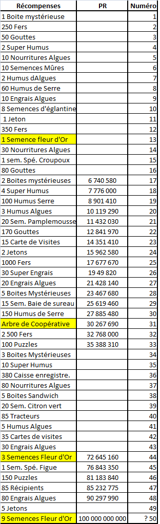 Mais là je suis très déçue. Je ne trouve pas que les récompenses de labeur soient beaucoup mieux qu'avant et en plus et surtout qu'ils nous sucrent notre permis or pour 3 semences de fleurs d'or je ne suis pas sûre d'être gagnante. Un permis or me faisait gagner 2000 or et en certitude. Les fleurs d'or peuvent me rapporter un minimum de 1200 or jusqu'à grand max 3600 or. Mais comme il y a beaucoup d'aléatoire dans tout cela il y a peu de chance que l'on gagne le maxi. Je reconnais que si on gagne le max 3 fois 1200 or oui là cela peut être rentable mais à voir pour ceux qui atteindront le dernier palier et qui sèmeront leurs semences qu'elle sera la perte ou le gain qu'ils feront. En tout cas sincèrement j'aurais préféré qu'ils nous laissent notre permis or plutôt que ces semences.
