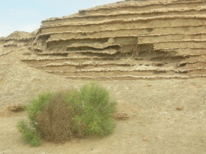 des couches de sable alternées avec des cailloux, des branches de tamaris et
