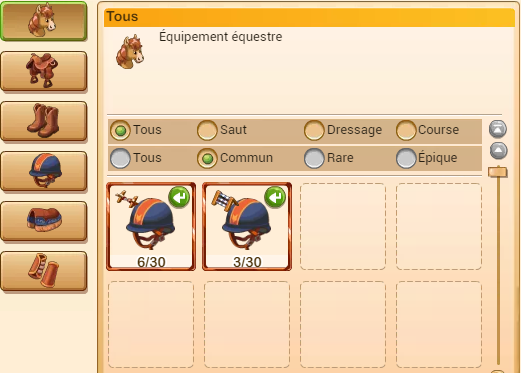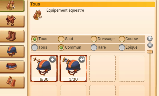 bonjour je n'arrive pas à ajouter d'équipement equestre avant de commencer une course, alors que j'en ai plein en stock