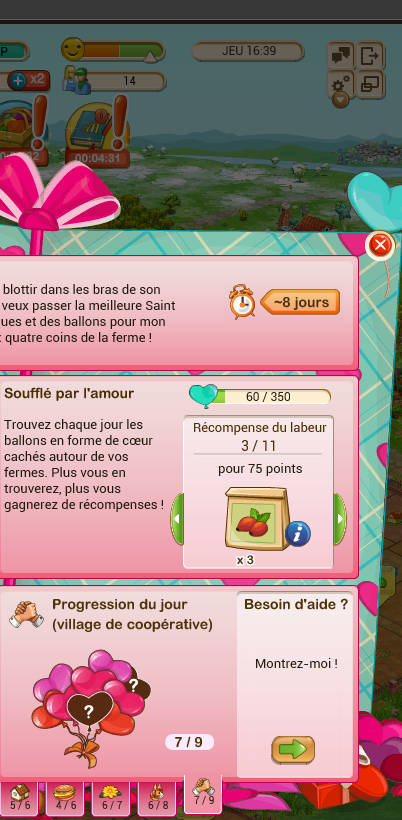 Je vous mets ici, un bug insolite d'un genre un peu différent, que j'ai eu ce jour pour la St Valentin ; solutionné par le fameux ctrl F5 où l'image à 9 ballons est redevenue image à 8, ensuite ! Ctrl F5 devenant le nouveau "Sésame ouvre toi" pour à peu près tout sur le jeu.