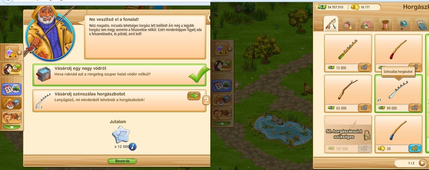 sziasztok nálam is hibás a horgászat 1ik feladtatban az van, h vegyek 1 szénszálas horgászbotot. vettem egyet és a feladat nem teljesült. a lovarda is hibás, nem engedi hogy a lovakat szabadon engedjem