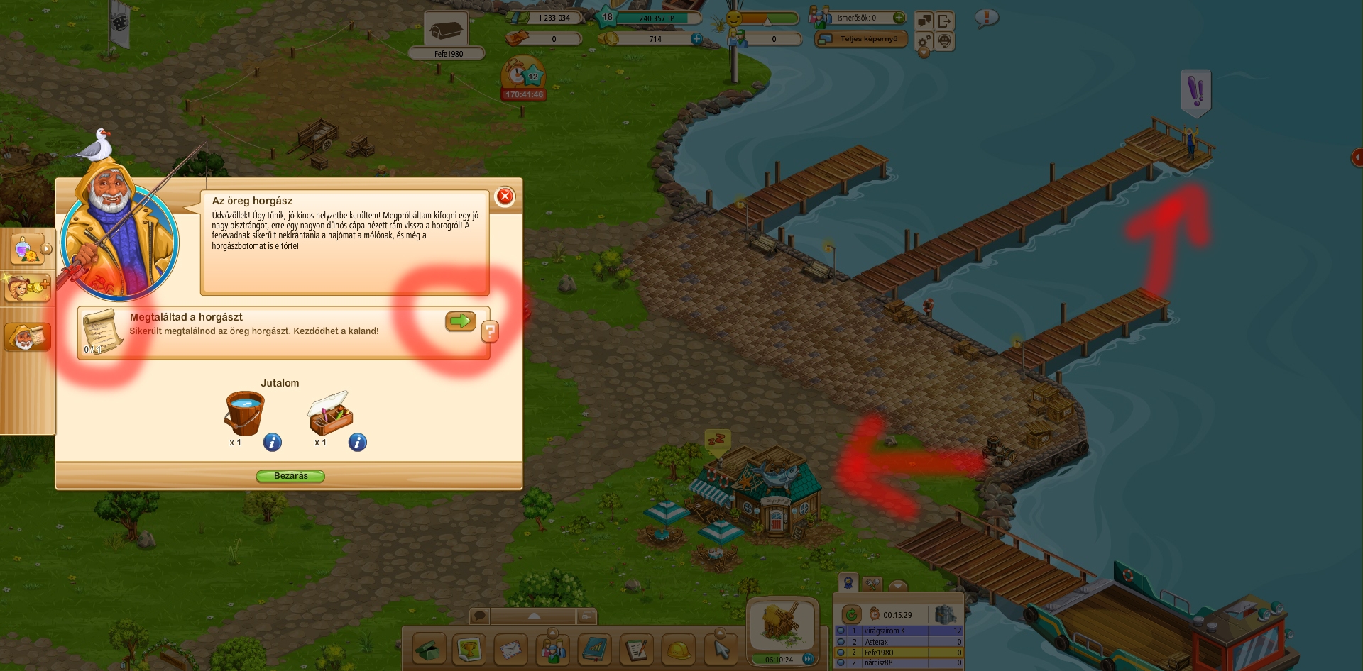 Sziasztok! Nekem az a problémám, hogy az első horgászós küldinél már nem jutok tovább. Napok óta itt állok. Meg kell találni a horgászt. A horgász megvan, feljön az ablak azt mondja, hogy megvan és nem történik semmi. Innen hogyan tovább?