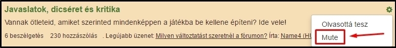 Ha az utóbbit (Mute) választjátok, akkor a Legfrisebb beszélgetések között nem fog megjelenni az abba a témába létre hozott újabb poszt vagy topik. Ezt lehet például alkalmazni annak, aki írta a Vidámság, szórakozást...vagy a szövetkezetek hirdetéseit. Ugyanakkor nem kell megijedni, ez egy olyan opció, amit vissza is lehet állítani. Csak a fő oldalon ugyanúgy rá kell kattintani a fogaskerékre és az Unmute lehetőséget választani.
