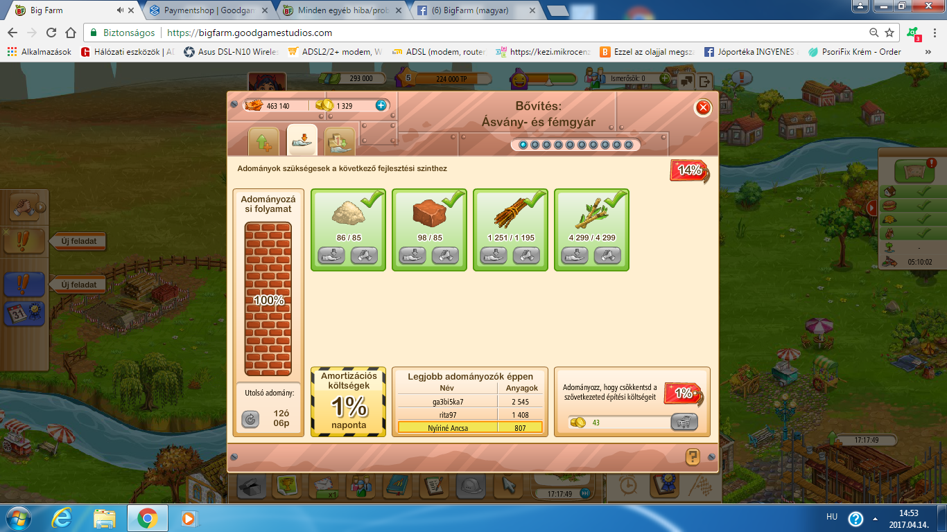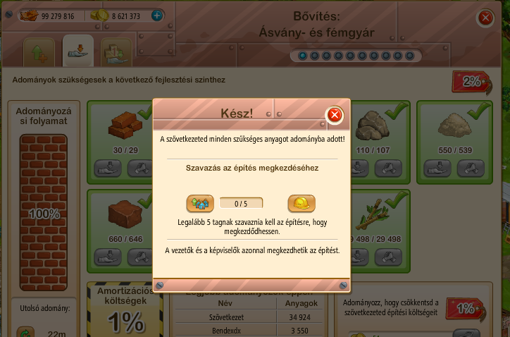 Sziasztok hol tudom jelezni, hogy javítsák meg az Ásvány és fémgyár hibáját, mindent kipróbáltunk és nem megy más fejlesztés. Nem adja be, a bővítésre, ha rámegyek, h elindítsuk, hanem visszadob az adományozó oldalra. Semmit nem fogad el nem tudjuk törölni nem tudunk vele haladni a bank, gyár raktár működik csak ezzel vannak problémák. 14 % ra fel volt turbózva az adományköltségek csökkentése és meg is akadt. Szövi hozzájárulással befejezte és 100 %-os lett, de az amortizációs 1 %-os ktg. miatt visszament már egyszer 99 %-ra kiegészítettük és a hibája ugyan az. Tehát nem mi rontottuk el, hanem a rendszerben van valami gubanc és hát kellenek azok a termékek is, amit itt lehetne termelni pl. a szög. Ezt indítottuk el először és le is állt. Nem tudunk vele rendesen haladni segítséget kérnénk a hiba elhárításához, v valami visszajelzést, hogy mit tehetünk az ügy érdekében. Ez már a 2. nap, hogy nem boldogulunk vele.