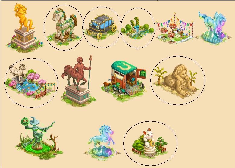 Sziasztok. Nekem az aranycsődőr hiányzik, sajnos nem sikerült megszereznem, de nagyon tetszik a csillogó mén, szívesen megszerezném belőle a musztángot is, és szeretem a tematikus épületek közül az egyiptomi csűrt, és szfinkszet is.