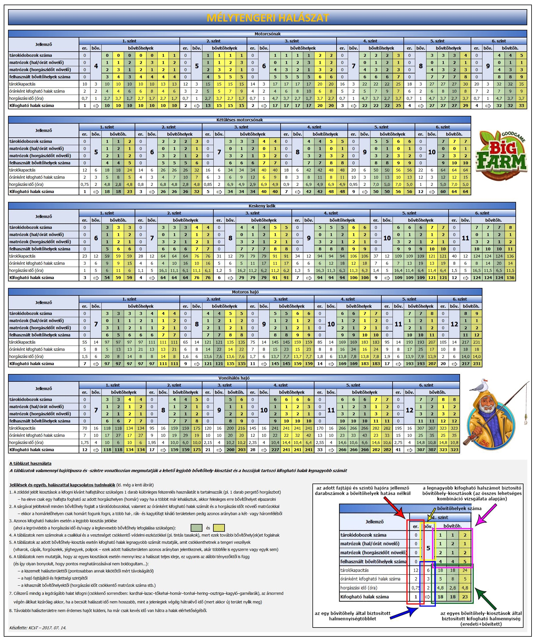 Megvizsgáltam az összes létező kombinációra valamennyi hajófajta összes fejlesztési szintjén a kifogható halak számát és azokból vettem a legtöbb halat adókat. Az összes bővítőhelyet kihasználva, valamint akkor, ha egyet fenntartunk a különleges felszerelésnek. Ennek eredményét láthatjátok a táblázatban.