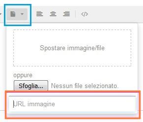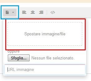 Aprendo la zona dell'editor dedicata all'inserimento delle immagini (riquadro azzurro) possiamo vedere come tra i metodi di inserimento sia presente anche il Spostare immagine/file (riquadro rosso).