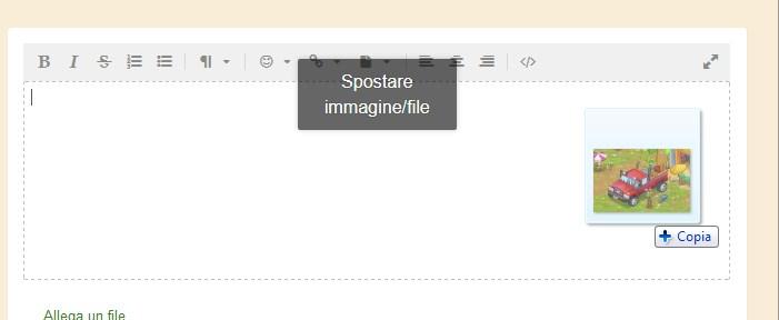 In realtà, per inserire un'immagine salvata nel computer trascinandola, non è necessario cliccare prima su Allega file/immagine, ma vi basterà trascinare l'immagine direttamente sul post.