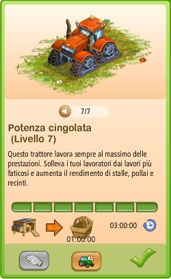 La Potenza cingolata è un macchinario da produzione che è possibile attivare ogni tot ore (dipendenti dal livello), Esso permette di scegliere se avere un bonus del 10%, 20%, 50% o 80% sui raccolti di pollai, porcili e stalle delle mucche. Il bonus viene applicato sia sul raccolto specifico dell'edificio che sul letame.