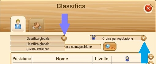 Per selezionare la Classifica PR basterà sceglierla nel menu a tendina indicato dalla freccia celeste, mentre per scegliere la Classifica globale o settimanale, basterà scegliere dal menu a tendina indicato dalla freccia viola.