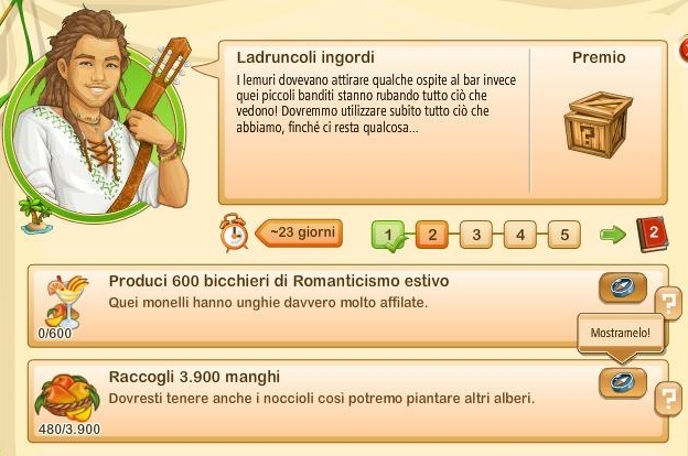 Ci accorgeremo che sarà arrivata l'Isola Tropicale quando tra i nostri compiti sulla sinistra della schermata di gioco apparirà quello in cui Eva Apple ci chiede di aiutare suo fratello Johnny con il suo bar sulla spiaggia.In ordine sono: