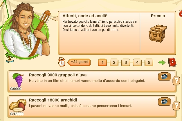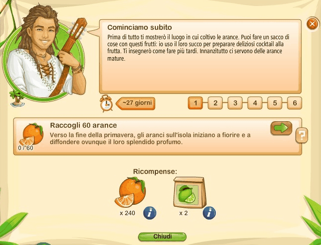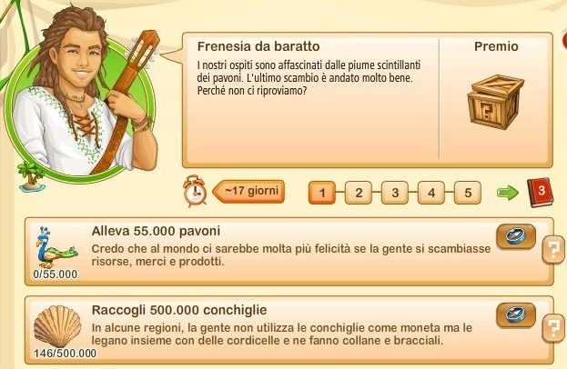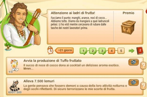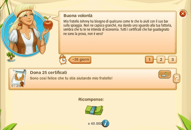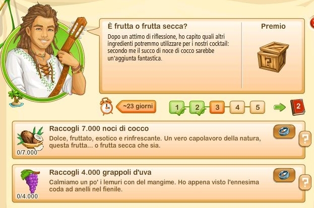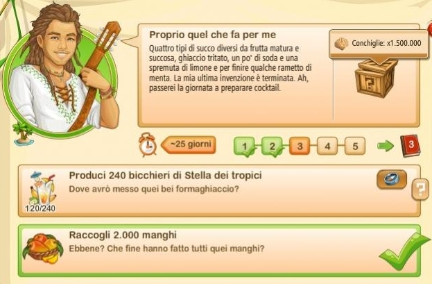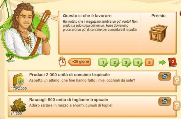 Essi si rinnovano ogni giorno alle ore 00.00, sono sempre tre e sono casuali. Questo significa che non sono legati ne al vostro livello di gioco ne al livello della vostra Fattoria Tropicale. Quindi non sempre vi sarà possibile portarli a termine.