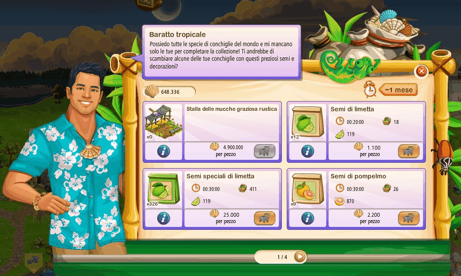 Con l'attività della Fattoria Tropicale accumuliamo conchiglie. Esse ci serviranno per acquistare alcune cose dal Mercante di Conchiglie.