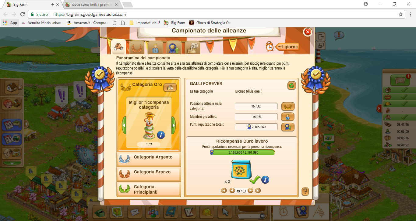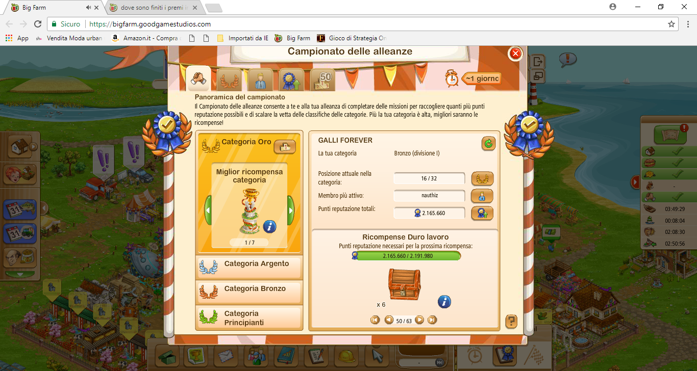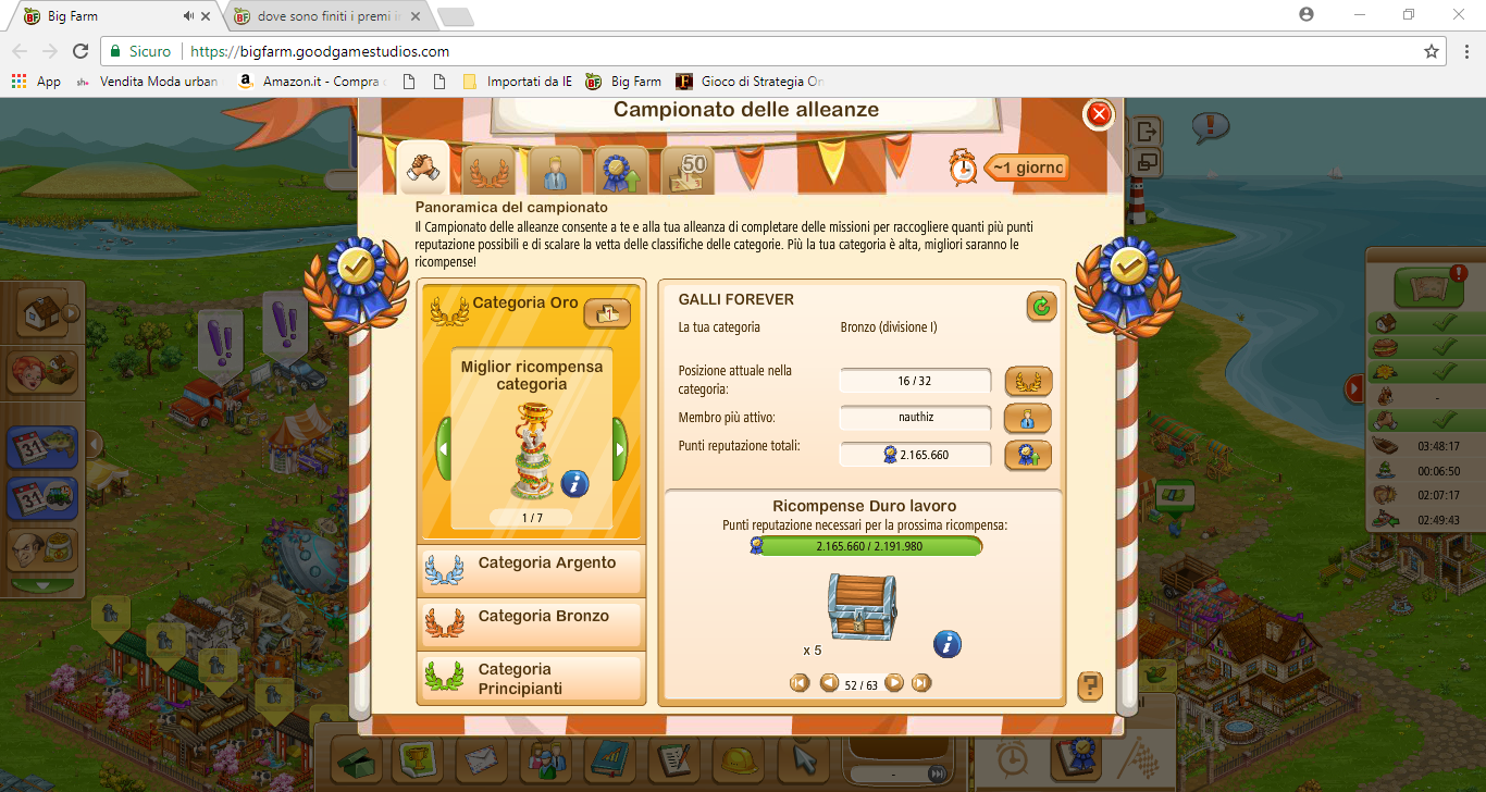ciao @Cassiopea82 io e la mia alleanza abbiamo un grosso problema con i premi intermedi del campionato delle alleanze.ci mancano (non sono stati accreditati ) i premi 50 /51/52 della categoria bronzo adesso siamo al 54 su 63 ma anche a tornare indietro ai bauli manca la spunta e in magazzino non appaiono ,al momento abbiamo 2.165.660 punti totali,adesso dimmi che devo contattare il supporto che esco subito dal gioco ,non è possibile che ogni giorno venga a mancare o non venga accreditato ciò di cui abbiamo diritto,buon pomeriggio