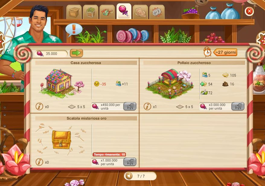 vorrei azzardare un ipotesi.. probabilmente non è giusta la scritta.. non è Tempo rimanente ma la quantità massima acquistabile con i lecca lecca cioè come da immagine: massimo 50.000.000 lecca lecca (la quantità massima del magazzino invece è 2.000.000.000) massimo 10 scatole misteriose oro (quantità massima immagazzinabile illimitata) e così le altre cose che hanno un limite d'acquisto... tipo le decorazioni