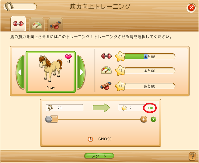 馬小屋で、Doverという馬を選択し、筋力向上トレーニングへ移動するとクリックして開いた画面です。