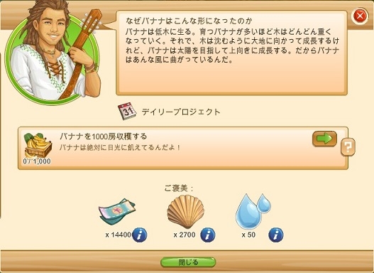 今回私のところは、「ピーナツ集め」と「ビーチクラブへ2回行く」と「サル600匹飼育する」というもので、ラッキー!楽勝じゃん!!って喜んじゃいましたよ。