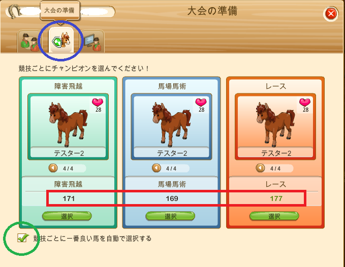 ※緑丸のチェックを入れると、各競技の数字が一番良い馬を自動で選んでくれます。