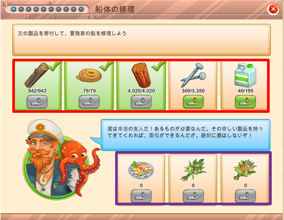 ※次回船の到着時に2つのお土産を貰えるように、冒険者の船の修理をお手伝いします。(上図 赤丸)