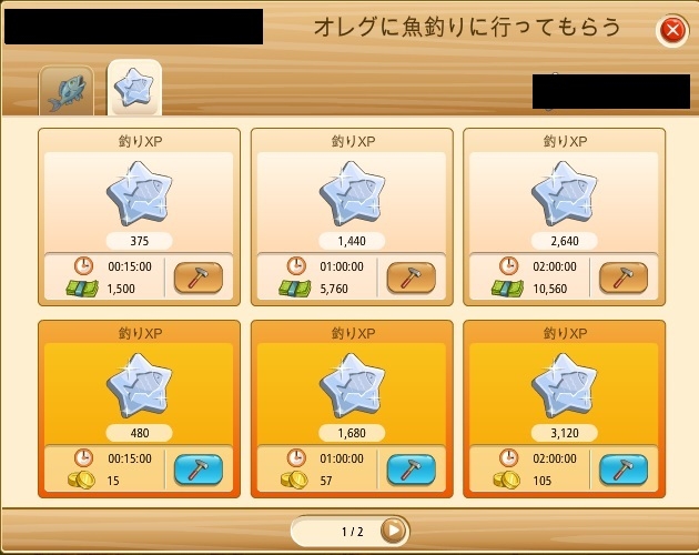 ご存知かもしれませんが、オレグに釣りに行ってもらうの項目に釣り経験値を稼げるものがあります。