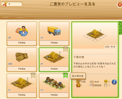 干草の俵② 1,100メダル 満足度+4 里の満足度+10
