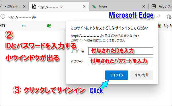 Edgeと同じように小ウインドウが出てIDとパスワード入力を求められます。