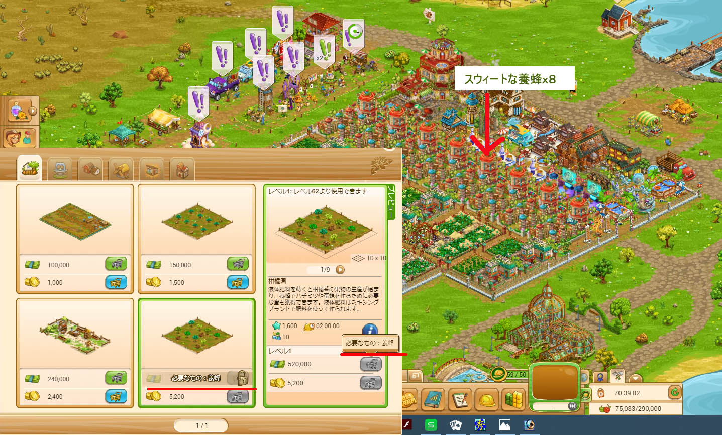 柑橘園は、養蜂を設置していること*に加えて、1個目がプレーヤーレベル62~、2個目がプレーヤーレベル65~(3個目はチェックミスでレベル不明)