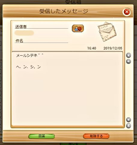 脅迫者のアカウント名は消してあります。恐らく脅迫用に作成したアカウント(ごく低レベルのファーム)であり、本人は隠れているつもりでしょうが、BF側でIPアドレスを調べれば本人が判明します。脅迫者は、恐らく「漢字かな混じり文」を書けない人です。